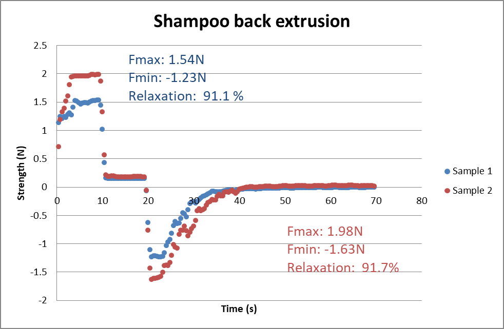 Shampoo is poured inside the extrusion cell in order to allow liquid to rise without overflow. The three steps process include a 10mm compression at 1mm/s followed by a 10s relaxation. The final step is 50mm of traction at 1mm/s.